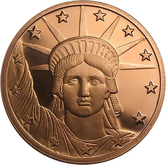 Enthält eine AVDP-Unze (28,75 g) Feinkupfer. Einzelmünzen werden in Münztschen geliefert. 20er-Bestellungen werden in verschlossenen Tuben versendet.  Ab 500 Münzen liefern wir in Masterboxen aus. Das Motiv zeigt das Konterfei der Freiheitsstaue mit einer Krone, welche 7 Zacken zeigt und von 13 Sternen umgeben ist. Diese Medaillen tragen keinen tatsächlichen Nennwert.
