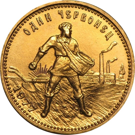 Auf der Vorderseite der geschichtsträchtigen Goldmünze findet sich einen Bauern aus Zeiten der Sowjetunion. Er hält einen Behälter in der Hand, der von einem Tuch um seinen Hals stabilisiert wird. Er findet sich auf dem Feld und erntet. Im Hintergrund sind Fabriken mit qualmenden Schornsteinen zu sehen. Unter dem rechten Arm scheint die untergehende oder aufgehende Sonne hervor. Die Münze wurde im Jahr 1977 geprägt. In der direkten Übersetzung steht Tscherwonez für die rote Münze. Auf der Rückseite findet sich das Wappen der RSFSR und damit der Russischen Sozialistischen Föderativen Sowjetrepublik. Im Zentrum der Goldmünze finden sich Hammer, Sichel und der Ehrenkranz und damit die Sinnbilder des Sozialismus.