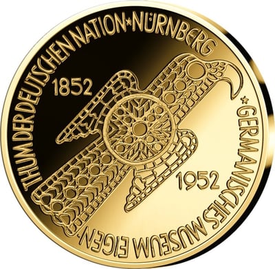 Die Rückseite zeigt stolz das Wappen des Germanischen Museums, flankiert von den bedeutungsvollen Jahreszahlen 1852 und 1952. Diese Daten markieren wichtige Meilensteine in der Geschichte dieser ehrwürdigen Institution, die seit ihrer Gründung das deutsche Kulturerbe bewahrt.