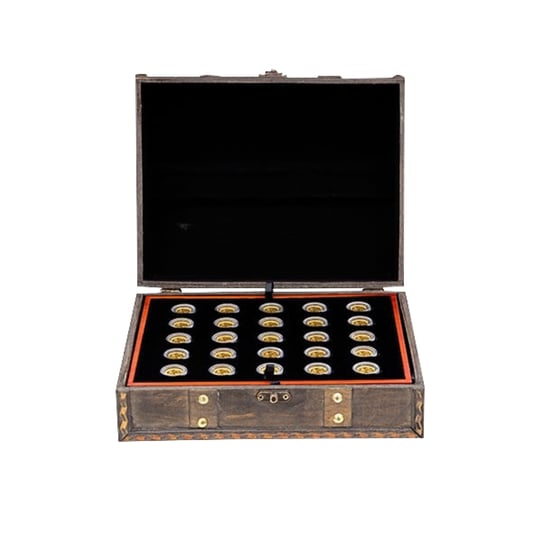 Einhundert Goldmünzen befinden sich in dieser Schatztruhe. Die Goldmünzen gehören zur bekannten American Eagle-Serie und wurden im Jahr 2023 von der Prägestätte United States Mint herausgebracht. Die Goldmünzen wurden jeweils mit einem Nennwert von 5 US-Dollar versehen und mit der Stückelung 1/10 Unze gefertigt. Das Gewicht der Schatztruhe beträgt insgesamt 311,03 Gramm.