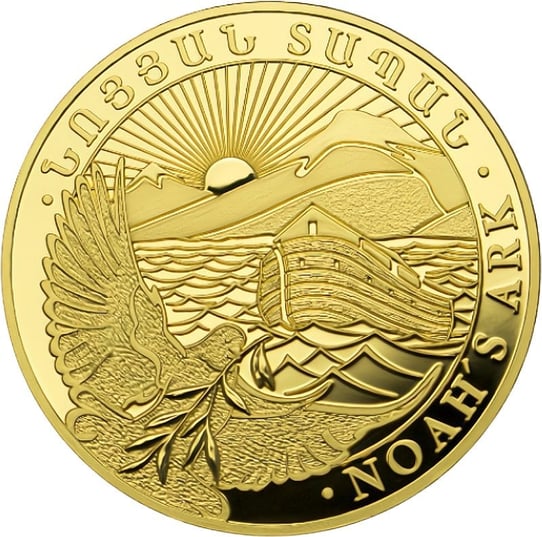 Auf der Motivseite dieser Goldmünze ist die Arche von Noah eingeprägt. Der Sturm ist überstanden, die Sonne scheint und die Arche steuert auf den Berg Ararat zu. Im Vordergrund ist die weiße Taube zu sehen. Sie hat den Ölzweig im Schnabel, um Noah die freudige Botschaft zu überbringen.