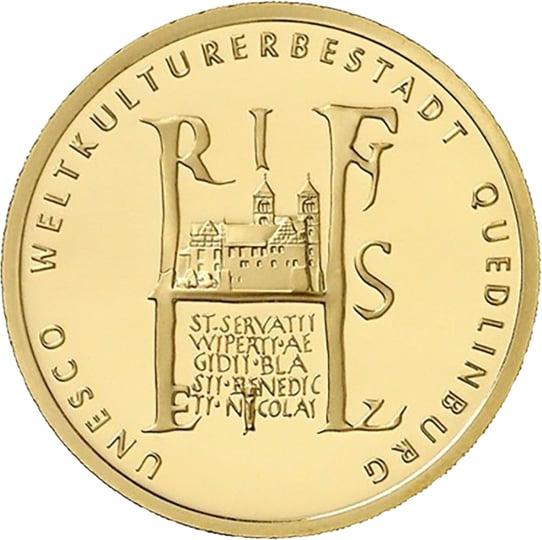 - Motiv: Die Münze ist der UNESCO-Weltkulturerbestadt Quedlinburg gewidmet und trägt eine detailgenaue Darstellung des Siegels von Kaiser Heinrich I. im Hintergrund ist die im 11. Jahrhundert fertiggestellte Quedlinburger Stiftskirche St. Servatius zu sehen.