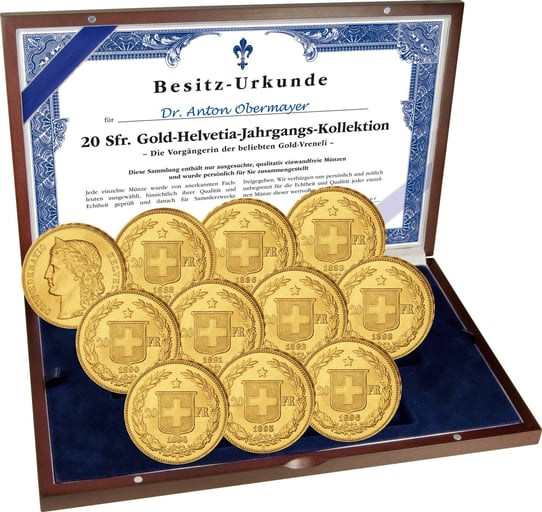 Ein Schatz der Numismatik: Der Komplettsatz 10x20 Schweizer Franken Gold Helvetia