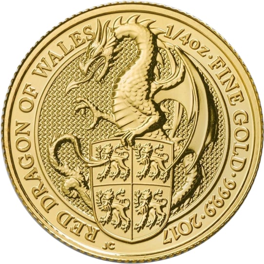 Die 1/4 Unze Goldmünze The Queen's Beasts Red Dragon 2017 hat einen Durchmesser von 22,00 mm und ein Feingewicht von 7,78 g. Sie ist prägefrisch und in einer Münzkapsel verpackt. Der Nennwert beträgt 25 GBP. Sie wurde im Jahr 2017 geprägt.