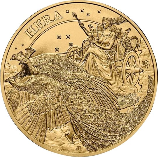 Diese Goldmünze ist der Göttin Hera gewidmet. Die Motivseite zeigt Helga in einer edel aussehenden Kutsche, die einer Göttin würdig ist. Hera trägt ein langes Kleid und hat die Beine überschlagen. Ihre langen Haare wehen im Wind. In der rechten Hand von Hera befindet sich Zepter, der ihre Macht symbolisiert. Um den Zepter herum funkeln viele kleine Sterne. Hera fährt allerdings nicht alleine auf der Kutsche, sondern ist in Begleitung eines Pfaus. Dieser sitzt links neben ihr. Die Kutsche wird auch nicht wie gewöhnlich von Pferden gezogen, sondern von drei sehr großen Pfauen. Der Pfau ist das Lieblingstier von Hera. Sie wird deshalb meistens mit einem Pfau dargestellt. Eine Legende besagt, dass Hera dem hundertäugigen Argos, der von dem Gott Hermes getötet wurde, die Augen entnommen haben soll, um damit die Federn des Pfaus zu schmücken.