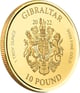 Die Wertseite der Münze ist mit dem Wappen von Gibraltar geprägt. Dieses besteht aus einer Burg, an deren Tor ein außergewöhnlich großer Schlüssel hängt. Über dem Wappen Gibraltars ist das Wappen des Vereinigten Königreichs zu sehen, denn Gibraltar ist ein britisches Überseegebiet. Seitlich neben dem Wappen befindet sich ein Löwe, der eine Krone trägt, und ein magisches Einhorn.