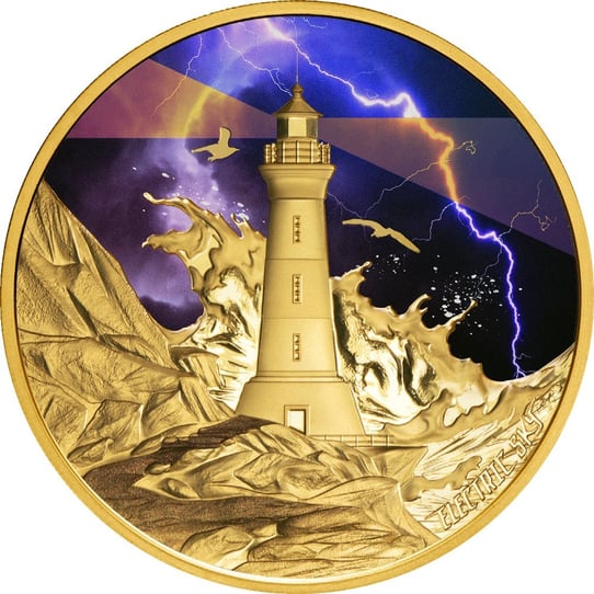 Die Vorderseite dieser Münze zeigt einen majestätischen Leuchtturm, der inmitten eines tosenden Sturms steht. Die dramatische Szene wird durch aufgewühlte Wellen, die gegen felsige Klippen schlagen, und einen von Blitzen erleuchteten Himmel in leuchtenden Violett- und Blautönen dargestellt. Zwei Vögel fliegen als Silhouetten gegen den stürmischen Himmel, was dem Motiv eine lebendige und dynamische Wirkung verleiht.