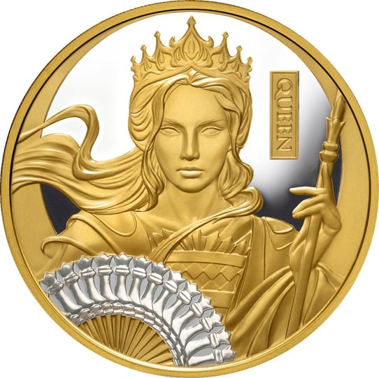 Das majestätische Motiv zeigt eine königliche Dame in prachtvollem Gewand mit Schachbrettmuster. Besonders beeindruckend ist der kunstvoll gestaltete Fächer aus Schachfiguren, der durch eine edle Platinbeschichtung zusätzlich veredelt wurde. Die Rückseite ziert das Portrait von König Charles III. sowie die technischen Angaben zu dieser exklusiven Ausgabe.