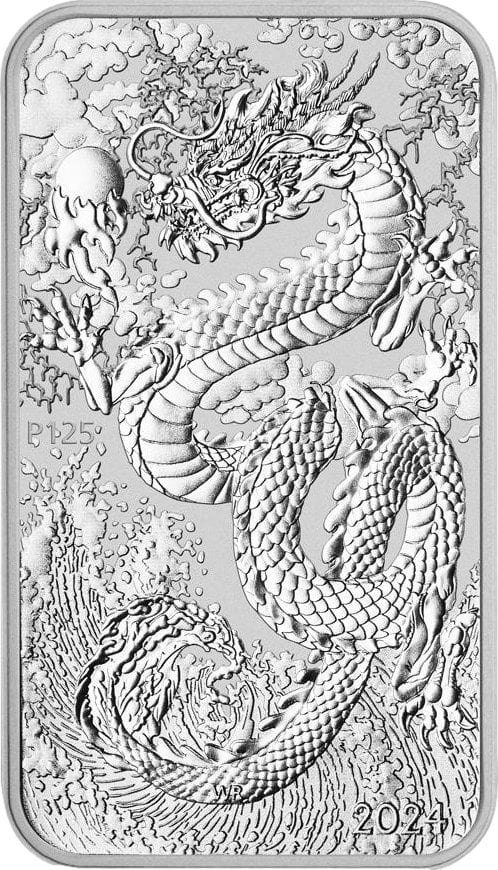 Die Vorderseite des Münzbarrens zeigt einen imposanten orientalischen Drachen, der eine flammende Perle betrachtet. Diese Darstellung ist tief in der chinesischen Mythologie verwurzelt und symbolisiert Weisheit und Macht. Der Drache ist fein detailliert, mit gut erkennbaren Schuppen und Krallen, und wird von Wasser und Wolken umgeben, die als Glücksbringer gelten. Das Prägejahr „2024“ ist ebenfalls auf der Vorderseite zu sehen und weist darauf hin, dass es sich um das Jahr des Drachen handelt. Ein besonderes Highlight ist das Münzzeichen „P125“, das das 125-jährige Bestehen der Perth Mint feiert.