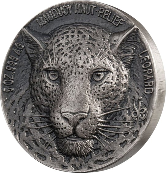 Auf der Rückseite der Münze zeigt sich das faszinierende Gesicht eines Leoparden in all seiner Pracht und Gefährlichkeit. Die Inschriften "5 OZ .999 AG", "MAUQUOY", "HAUT-RELIEF" und "LEOPARD" zieren die Oberseite der Rückseite und unterstreichen die Einzigartigkeit dieser Münze.