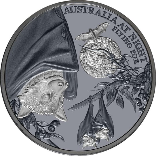 Die Gestaltung dieser einzigartigen Silbermünze ist wahrlich faszinierend und zieht Münzsammler weltweit in ihren Bann. Sie stellt einen außergewöhnlichen Flughund dar, der kopfüber an einem Ast hängt. Im Hintergrund sind zwei weitere Flughunde in gleicher Haltung zu sehen, während ein weiterer Flughund majestätisch vor dem Vollmond fliegt. Die Motivseite der Münze ist mit der Inschrift „AUSTRALIA AT NIGHT – FLYING FOX“ verziert, was den nächtlichen Kontext der Darstellung unterstreicht.