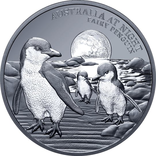 Das faszinierende Design zeigt drei lebensfrohe Zwergpinguine am Strand, deren Silhouetten sich sanft vom schimmernden Mondlicht abheben. Der aufgehende Vollmond lässt den Himmel erstrahlen und verleiht diesem Motiv eine magische Atmosphäre, die auf der Münze Black Proof Qualität perfekt eingefangen wird. Die Münze trägt stolz die Aufschrift "AUSTRALIA AT NIGHT - FAIRY PENGUIN", eine Würdigung der nächtlichen Schönheit Australiens und seiner charismatischen Bewohner.