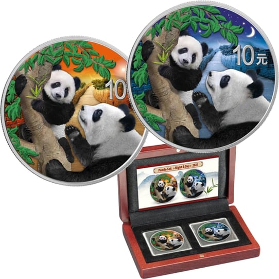 Dieses Set besteht aus zwei Münzen, die jeweils 30 Gramm Silber wiegen und einen Durchmesser von 40 mm haben. Sie sind Teil der "Night & Day" Serie und der "Panda" Kollektion. Die Münzen haben eine Feinheit von 999 und wurden in prägefrischer Qualität geprägt. Die Münzen sind coloriert und zeigen das Panda-Motiv einmal bei Tag und einmal bei Nacht, dank einer innovativen Farbtechnik. Das 2021er Motiv zeigt einen Großen Panda im Vordergrund und ein Jungtier, das einen Eukalyptusbaum emporklettert, im Hintergrund. Auf der Rückseite ist die jährlich gleichbleibende Abbildung des berühmten Himmelstempels in Peking zu sehen, der seit 1998 Teil des UNESCO Weltkulturerbes ist.