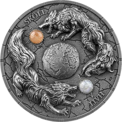 Die Münze ist Teil der neuen Ragnarök-Serie von Germania Mint, die das mythische Ende der Welt darstellt. Auf der Vorderseite dieser beeindruckenden Münze sind Sköll und Hati abgebildet, die Nachkommen des mächtigen Fenrir. Sie jagen Sonne und Mond über den Himmel, und ihre Ergreifung leitet das Ragnarök ein, das die Welt in Dunkelheit stürzt. Bei Beleuchtung mit UV-Licht leuchtet die Welt in "heiße Lava", und die Himmelskörper sind mit Sonnenstein und Mondstein verziert.