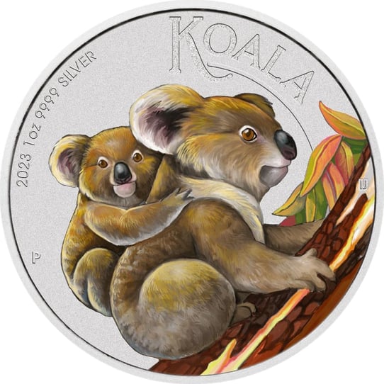 Das farbenfrohe Motiv auf der Münze zeigt einen Koala mit seinem Jungtier, die gemeinsam einen Eukalyptusbaum erklimmen - ein charakteristisches Bild der australischen Wildnis. Die Münze ist umrandet von den Aufschriften "KOALA", "2023 1oz 9999 SILVER" und dem Prägezeichen "P" der Perth Mint, was ihre Authentizität und Qualität unterstreicht.