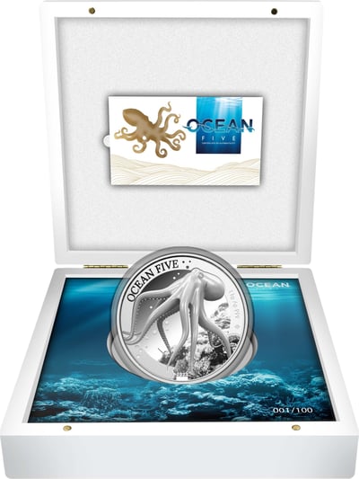 Die hinreißende Motivseite zeigt einen Oktopus, der durch das klare Wasser des Ozeans schwimmt. Der Betrachter fühlt sich, als ob er selbst in die faszinierende Welt des Meeres eingetaucht ist, während er die kunstvollen Details der Pflanzen und des Wassers betrachtet. Die Vorderseite der Münze enthält außerdem die Aufschrift „OCEAN FIVE“ sowie Angaben zum Prägejahr, der Stückelung und der Feinheit. Dies verleiht der Münze eine zusätzliche Note von Eleganz und Wertigkeit.