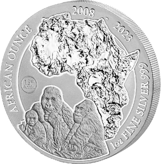 Die siebzehnte Ausgabe der African Ounce Serie aus Ruanda ist dem Berggorilla gewidmet, welcher im Jahr 2008 auch die erste Ausgabe der Serie zierte und damit im Jahr 2023 sein 15. Jubiläum begeht. Das Motiv zeigt eine Abbildung des afrikanischen Kontinents sowie eine Gorilla-Familie. Im Design enthalten sind außerdem die Aufschriften “AFRICAN OUNCE”, “2023”, “1oz FINE SILVER 999” und die Jahreszahlen zum Jubiläum “2008 – 2023”. Auf der Rückseite ist das Wappen Ruandas zu sehen.