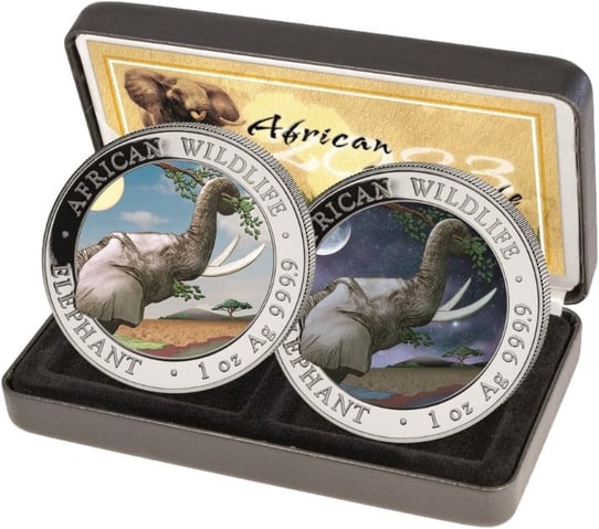 2 x 1 Unze Silber Somalia Elefant Tag & Nacht Set 2023 (Auflage: 500 | coloriert)