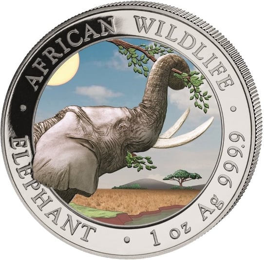 Hitze macht nicht nur durstig, sondern auch hungrig. Genauso geht es dem Afrikanischen Elefanten, der auf der colorierten Vorderseite der Silbermünze zu sehen ist. Aus diesem Grund stillt er seinen Hunger mit leckeren Ästen eines Baumes.