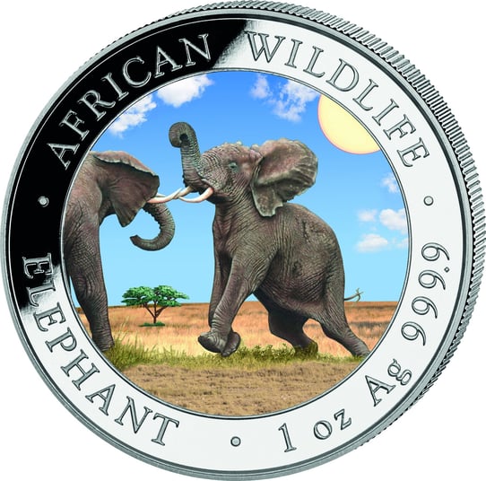 Die Münze besticht durch ihr einzigartiges Design. Auf der Vorderseite sind zwei Elefanten vor einer idyllischen afrikanischen Landschaft abgebildet. Die detailreiche Darstellung und die feine Colorierung machen diese Münze zu einem echten Blickfang. Auf der Rückseite der Münze ist das Staatswappen von Somalia abgebildet, was der Münze einen offiziellen Charakter verleiht.