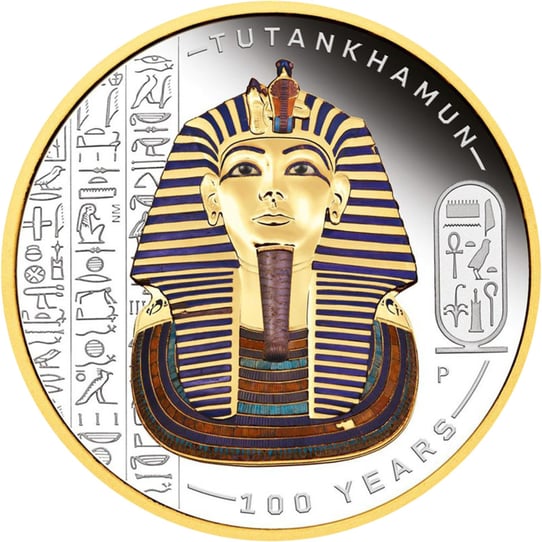 Die Silbermünze zeichnet sich durch ihre Polierte Platte (PP) aus, der höchsten möglichen Prägequalität. Das Motiv zeigt eine Abbildung der weltberühmten Totenmaske des Tutanchamun. Die selektive Farbapplikation und die Teilvergoldung mit 24-Karat Gold verleihen der Maske des Pharaos eine besonders detailreiche und realitätsnahe Optik. Im Hintergrund sind die Bildzeichen aus dem Totenbuch sowie ein Namensschild mit den Hieroglyphen "Herrscher von Heliopolis" zu sehen. Das Design enthält außerdem die Aufschrift "TUTANKHAMUN 100 YEARS" und das Münzzeichen "P" der Perth Mint.
