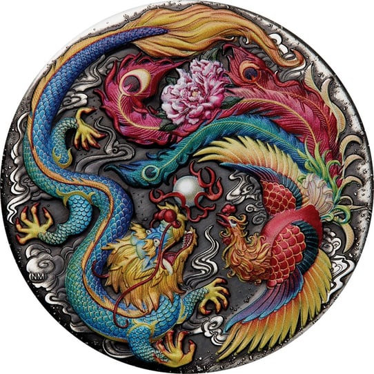 Das farbenfrohe Motiv dieser Münze zeigt einen Drachen und einen Phönix, zwei der bedeutendsten Fabelwesen der chinesischen Mythologie. Der Drache, ein göttliches Geschöpf, symbolisiert Macht, Reichtum und Glück. Der Phönix, ein unsterblicher Vogel, erscheint in Zeiten des Friedens und Wohlstands. Gemeinsam verkörpern sie die komplementären Eigenschaften von Yin und Yang und gelten als besonders glücksverheißend.