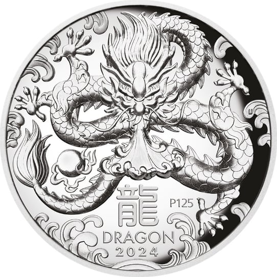 Auf der Vorderseite der Münze thront der chinesische Drache, ein Wesen, das in der östlichen Mythologie für Stärke, Glück und Wohlstand steht. Die dynamische und detailreiche Darstellung des Drachens zeigt ihn in voller Pracht, umgeben von Wolkenmotiven, die seine himmlische Verbindung unterstreichen. Das chinesische Schriftzeichen für "Drache" sowie die Inschrift "DRAGON 2024" verleihen der Münze eine zusätzliche exotische Note. Der "P125" Stempel, der an das 125-jährige Jubiläum der Perth Mint erinnert, zeugt von der langen Tradition und dem hohen Qualitätsanspruch der Prägestätte.