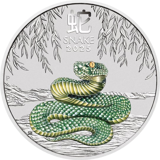 Das kunstvoll gestaltete Münzmotiv zeigt eine imposante Schlange in brillanten Grün- und Gelbtönen, umrahmt von zarten Weidenblättern. Als sechstes Tierkreiszeichen im chinesischen Kalender steht die Schlange für Weisheit, Intelligenz und tiefgründige Intuition. Die Rückseite ziert das zeitgemäße Porträt von König Charles III.