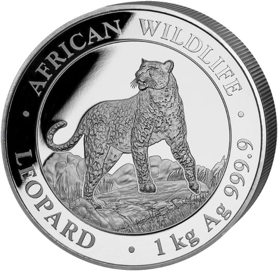 Die Vorderseite dieser Silbermünze zeigt einen Leoparden. Die gefleckte Großkatze steht auf einem Felsen und schaut zur Seite. Rechts unter dem Motiv wird angegeben, dass die Münze 1 Kilogramm wiegt und zu 99,99 % aus Silber besteht.