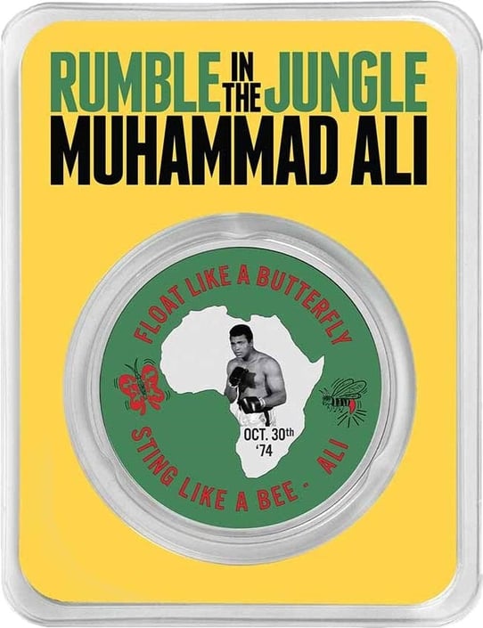 Die Münze zeigt auf der Vorderseite den berühmten Schriftzug "Float like a Butterfly, Sting like a Bee" auf einem grünen Hintergrund. Eingebettet in die Silhouette des afrikanischen Kontinents ist ein Abbild von Muhammad Ali und das Datum des legendären Kampfes. Die Rückseite ziert das Wappen von Niue und eine Ecke eines Boxrings. Diese detailreiche Gestaltung, gepaart mit der hohen Qualität des verwendeten Silbers, macht die Münze zu einem begehrten Sammlerstück.