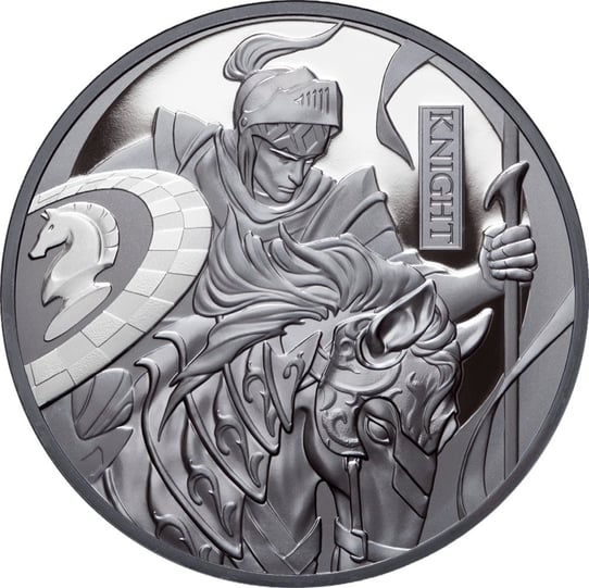 Das Motiv der Münze ist eine beeindruckende Darstellung eines Ritters auf einem Pferd. Dieses Detail ist eine Anspielung auf die Schachfigur des Springers, oft auch als "Pferd" bezeichnet. Der Ritter ist in voller Rüstung mit Lanze und Schild zu sehen, auf dem das Symbol des Schachpferdes abgebildet ist, begleitet von der Aufschrift "KNIGHT". Die Rückseite der Münze ziert das Portrait von König Charles III. und enthält Angaben zu Gewicht, Feinheit, Nennwert und Ausgabejahr.