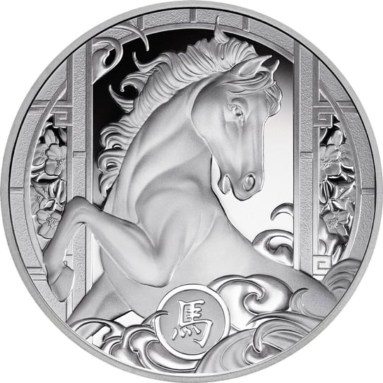 Die Vorderseite präsentiert ein kraftvolles Pferd in dynamischer Pose. Umrahmt von kunstvoll gestalteten floralen Elementen und stilisierten Wolken, scheint das edle Tier förmlich aus der Münze herauszuspringen. Jede Mähnensträhne, jeder Muskel wurde mit höchster Präzision herausgearbeitet. Das chinesische Schriftzeichen für "Pferd" fügt sich harmonisch in die Komposition ein und unterstreicht die kulturelle Bedeutung dieses majestätischen Tieres.