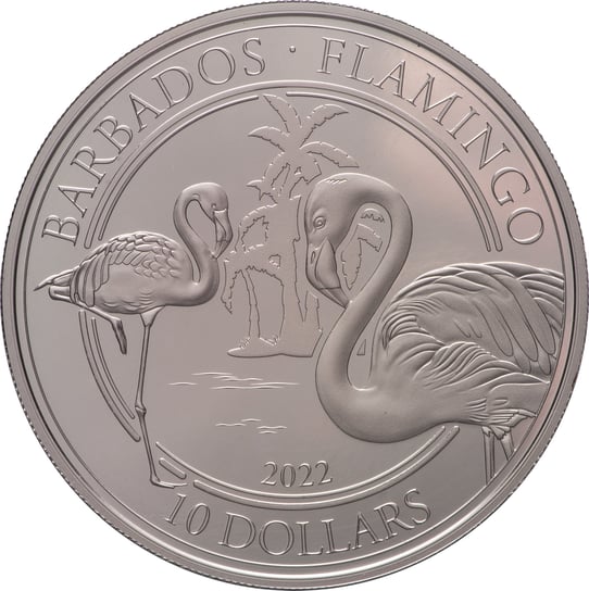 Die Wertseite dieser Platinmünze zeigt zwei Flamingos, die im Vordergrund zu sehen sind. Im Hintergrund sind das Meer und mehrere große und schöne Palmen abgebildet. Zu dem Münzmotiv gehören auch das Prägejahr sowie der Nennwert von 10 Barbados Dollar.