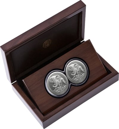 Der weltweit auf nur 1.000 Sätze limitierte Big Five Elefanten Silber-Satz würdigt diese faszinierende Spezies. Er wird in einer hochwertigen Doppel-Münzkapsel sowie einem edlen Holzetui geliefert, um die Erhabenheit des Elefanten angemessen zu präsentieren. Die Holzplatte mit den beiden Münzen lässt sich herausnehmen und umdrehen, sodass man wählen kann, welche Seite der Münzen man präsentieren möchte. Ein nummeriertes Echtheits-Zertifikat der South African Mint ist ebenfalls in der Lieferung enthalten.