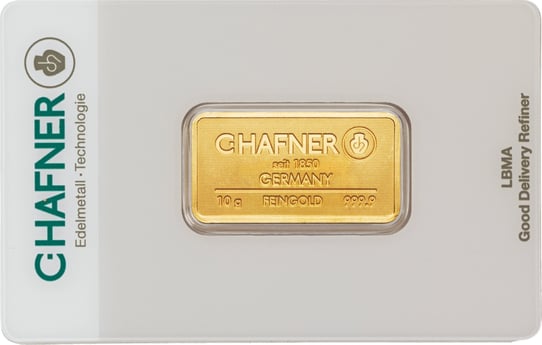 Möchten Sie Gold kaufen, gönnen Sie sich mit der Wahl eines 10 g Goldbarrens von C. Hafner gleich zahlreiche Vorteile auf einmal. Neben dem zertifierten „Good-Delivery-Status“ durch die LBMA, der damit garantierten Echtheit, Reinheit und Gewichtsklasse des glänzenden Edelmetalls, entfällt auf den Erwerb keine Mehrwertsteuer. Neben der hochwertigen Verarbeitung punktet die Stückelung des deutschen Herstellers mit einer ästhetischen Optik sowie einer Produktion nach ethischen und ökologischen Gesichtspunkten – das Unternehmen produziert sämtliche seiner Feingoldbarren durch Edelmetallrecycling.