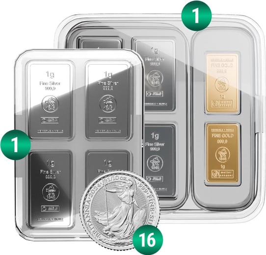 - 1 x 50 x 1g Silberbarren Heimerle und Meule: Diese Silberbarren stammen von einem der renommiertesten Edelmetallveredler und zeichnen sich durch ihre bankenübliche Qualität aus. Die Stückelung in 1g-Barren ermöglicht eine flexible Handhabung und leichte Portionierbarkeit.