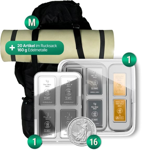- Krisensicher investieren: Das Krisenschutz Paket S + Rucksack M bietet eine solide Diversifikation und physische Wertanlage