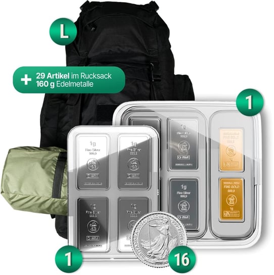 Zusätzlich zu den Edelmetallen erhalten Sie einen robusten Notfallrucksack L, der Ihnen hilft, Ihre Investitionen sicher zu transportieren und zu lagern. Dieser Rucksack ist nicht nur ein praktischer Begleiter in Krisenzeiten, sondern auch ein Symbol für die Voraussicht und Weitsicht, die Sie als Investor an den Tag legen.