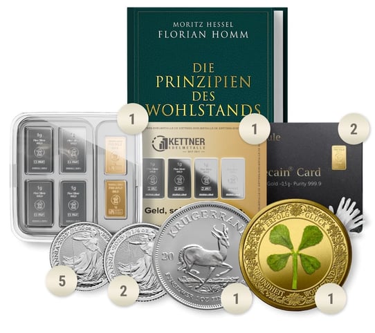 Das Paket setzt sich aus einer Vielzahl von Edelmetallen und Stückelungen zusammen, um Ihnen maximale Flexibilität und Sicherheit und Inflationsschutz zu bieten: