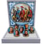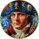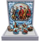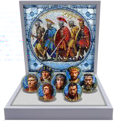 Das Set wird in einem eleganten Etui geliefert, das nicht nur Schutz bietet, sondern auch einen ansprechenden Rahmen für die Präsentation dieser hochwertigen Veredelung darstellt. Der Innendeckel des Etuis präsentiert ein großes Mosaik der Herrscher, umgeben von einem Meer aus Blautönen, das die einzelnen Münzen im Boden der Box widerspiegelt.