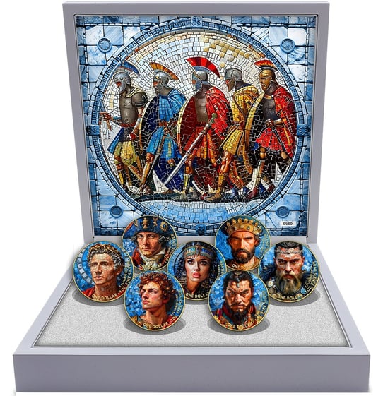 Das Berühmte Herrscher Silber Set 2024 ist eine Hommage an die bedeutendsten Persönlichkeiten der Geschichte – Alexander der Große, Napoleon, Julius Cäsar, Dschingis Khan, Kleopatra, Attila und Saladin. Mit einer Auflage von nur 50 Stück weltweit stellt dieses Set eine extreme Rarität dar, die in keiner Sammlung fehlen sollte.
