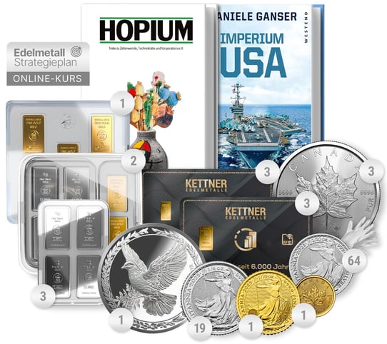 Mit dem umfassend konzipierten Rettungs-Paket M bieten wir Ihnen eine substanzielle Absicherung durch eine strategisch ausgewogene Kombination aus  Gold und Silber. Die sorgfältig ausgewählten Stückelungen verbinden nachhaltigen Inflationsschutz mit der Flexibilität eines unmittelbar verfügbaren Tauschmittels - die ideale Lösung für alle, die in unsicheren Zeiten auf bewährte Werte setzen.