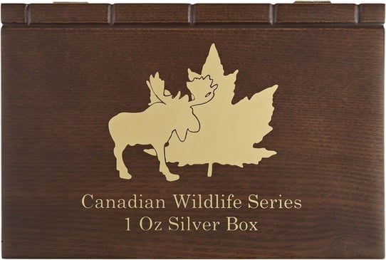 Die Münzbox ist aus edlem, dunklem Holz geschnitten und schließt fest mit kleinen, eingearbeiteten Magnetpunkten. Die Front zeigt das kanadische Symbol, das Ahornblatt, und einen davor stehenden Elch. Der Schriftzug „Canadian Wildlife Series 1 Oz Silver Box“ ist unterhalb dieser Bilder angebracht. Schrift und Bild sind mit goldener Farbe aufgebracht, was der Box eine besondere Qualität ausstrahlen lassen.